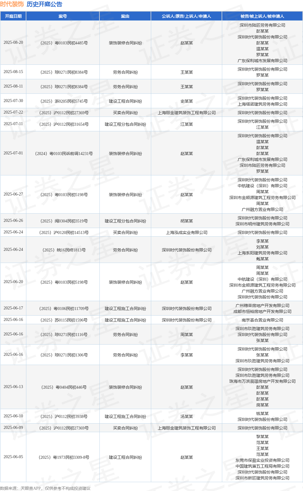 案号:(2025)粤0106民初11709号审理法院:广州市天河区人民法院案由:建设工程施工合同纠纷当事人信息: 原告/上诉人:深圳时代装饰股份有限公司 被告/被上诉人:广州穗荣房地产开发有限公司、成都市恒裕房地产开发有限公司开庭日期:2025年6月17日根据统计,近一年内以深圳时代装饰股份有限公司为当事人的历史开庭公告有141则,其中案由为“劳务合同纠纷”的公告以35则居首,其次为“建设工程施工合同纠纷”有28则,“装饰装修合同纠纷”有15则。历史开庭公告(前20条)如下: